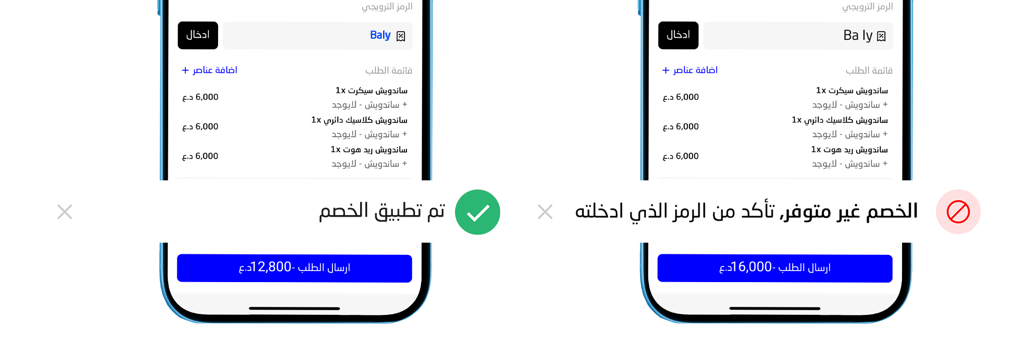- إذا الكود صالح، رح ينعكس على السعر مباشرة، وإذا لا – رح يطلع إشعار.