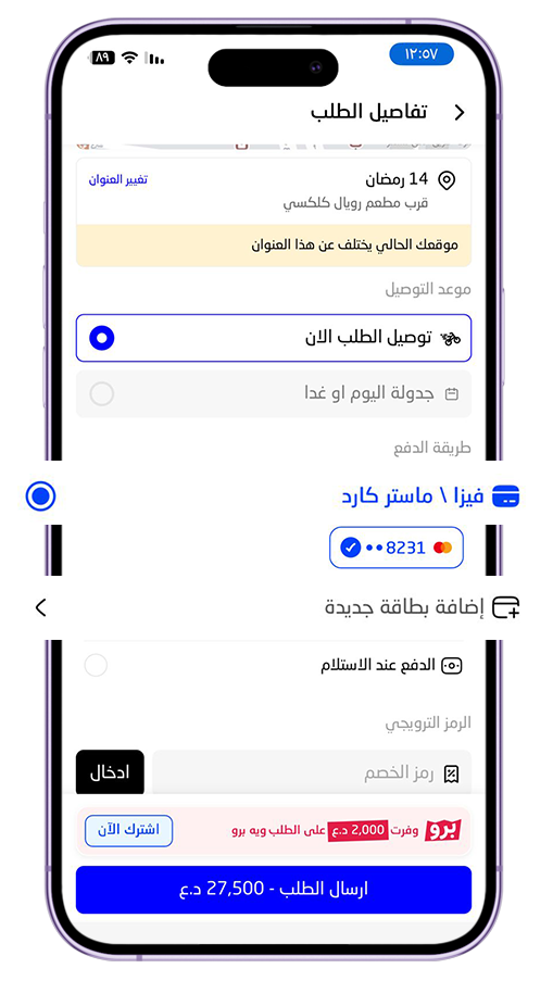 ومن تدخل بطاقتك أول مرة، التطبيق راح يحفظها تلقائياً حتى تكدر تستخدمها بسهولة بكل طلباتك الجاية.